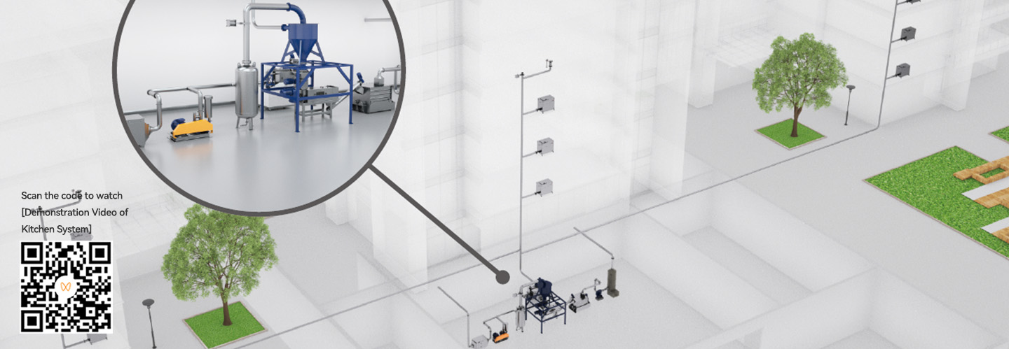 The use of pipelines for pneumatic collection has achieved fully enclosed garbage transportation, reducing the risk of secondary pollution and cross-infection to the environment caused by odors and splashes. The entire process is fully automated, significantly reducing the labor intensity of garbage collection, improving collection efficiency, and reducing human resources, greatly solving the problem of manual cleaning costs. The back-end disposal of garbage utilizes resource-based solid waste treatment technology, reducing the volume by up to 80% to 90%. The products can be used as organic nutrient soil, achieving the recycling of kitchen waste products.